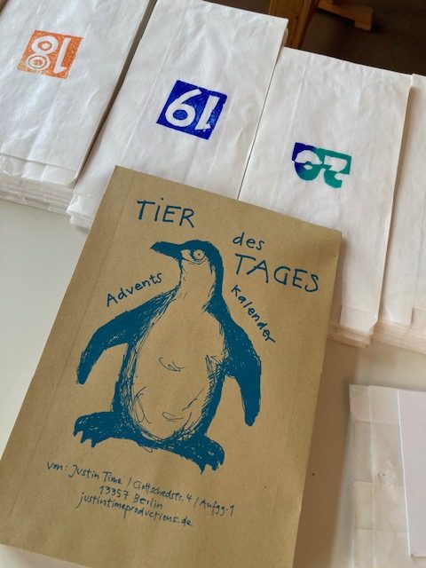 Tier des Tages Adventskalender Tier des Tages Adventskalender24 Tiere auf 24 Kartenin handgestempelten Tüten und mit Aufhängesystemim Umschlag40-60€ nach Selbsteinschätzung und Solidarprinzipschreibt eine Mail an justintime(at)posteo.de